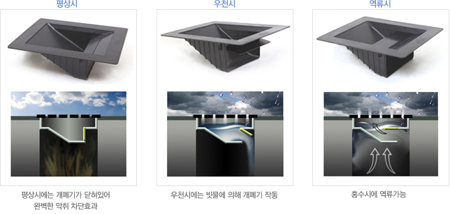 - 역수방지 및 병해충 예방하수구에서 발생하는 역류를 방지하며 병·해충으로 인한 각종질환과 환경오염을 미연에 예방합니다.